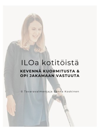 PS. Sinua saattaa kiinnostaa myös ILOa kotitöistä -oppaani, joka sisältää konkreettisia harjoituksia ja apulistoja, joiden avulla jaat kotityövastuuta ja kevennät kuormitustasi 🤎 Kokosin yhteen asiat, joihin voit vaikuttaa ajatuksien, keskustelujen ja tekemisen kautta. Löydät siis taatusti sopivia keinoja jokaiseen hetkeen ja tilanteeseen.