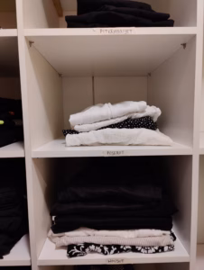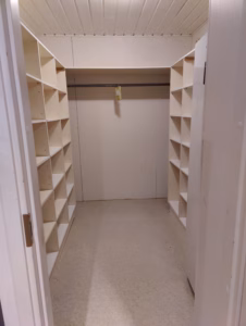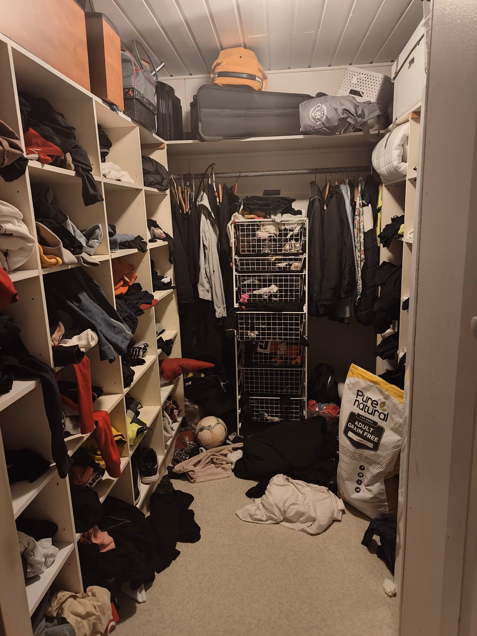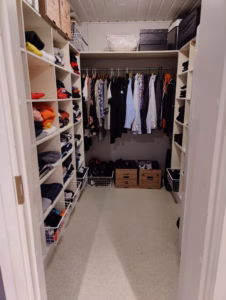 Tässä kohteessa oli tilava vaatehuone. Haasteena oli tavaramäärä ja osin toimimattomat ratkaisut. Asiakas karsi runsaasti tarpeetonta tavaraa, minkä ansiosta tila avartui. Järjestely tehtiin perheen tarpeiden mukaan: toimimaton korihyllykkö poistettiin ja kunkin perheenjäsenen vaatteiden paikat merkattiin selkeästi.
