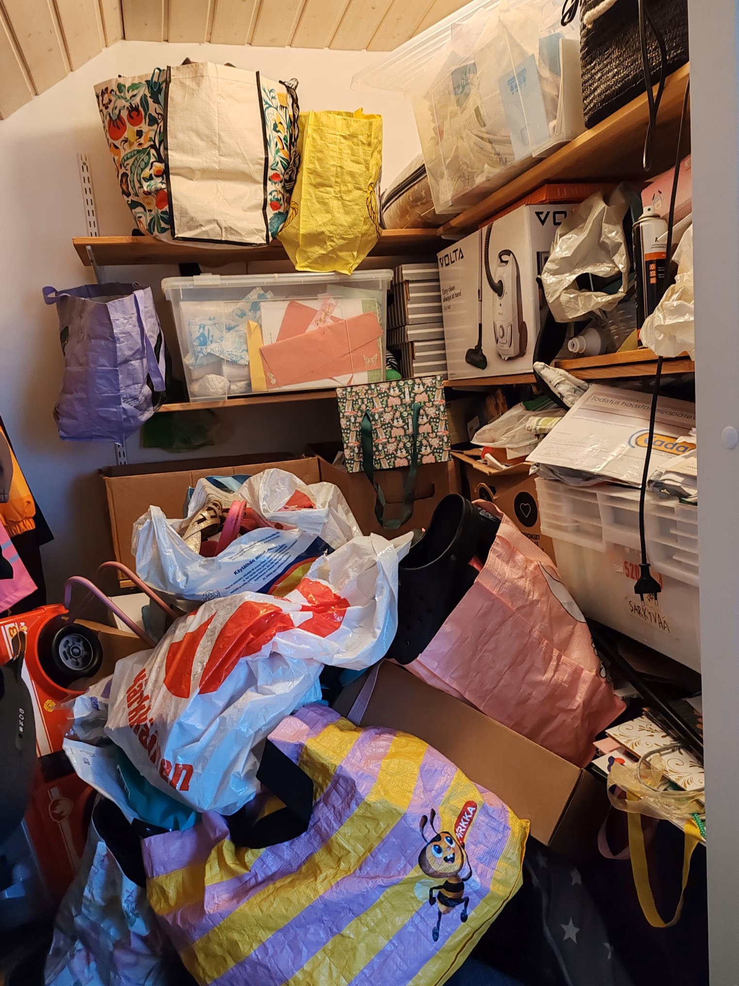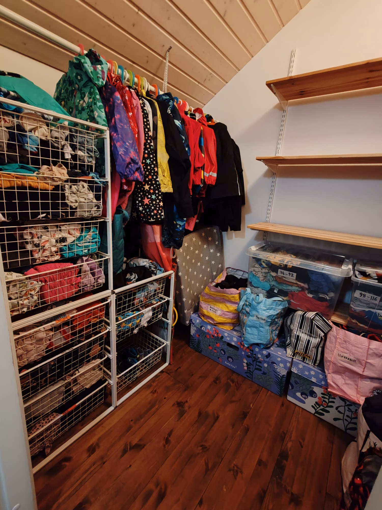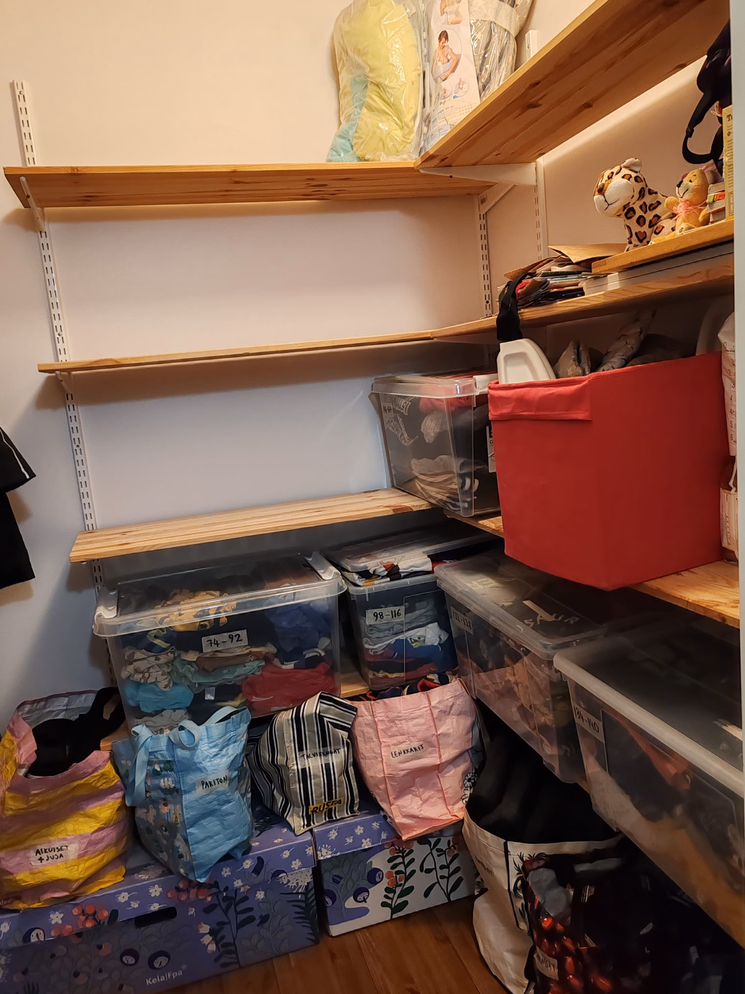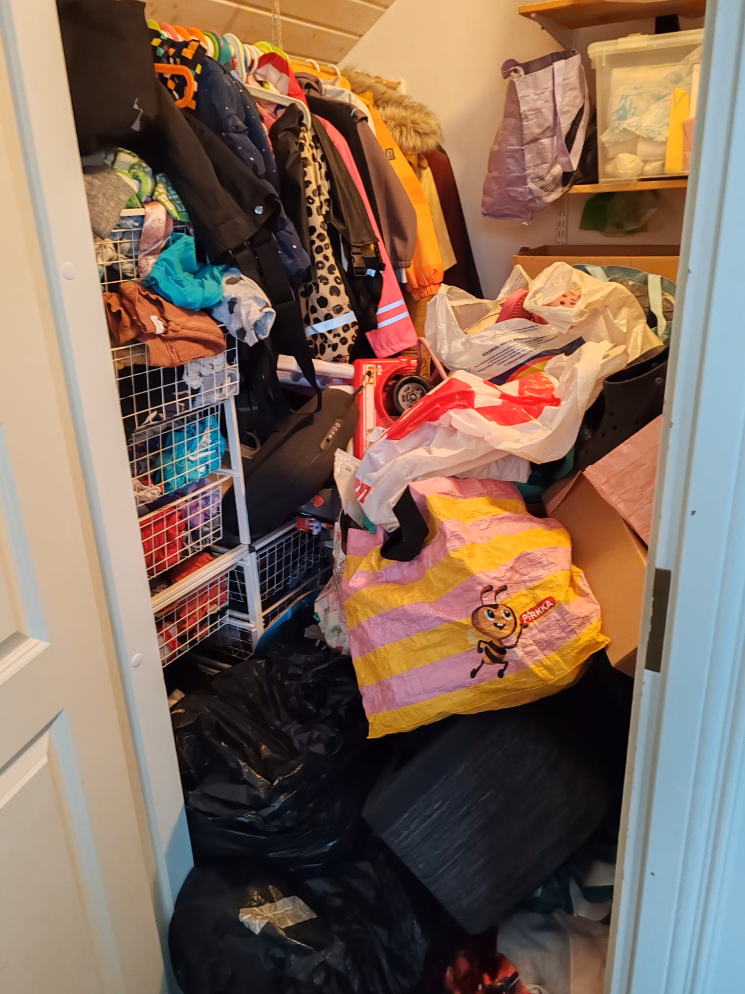 Perheelle tarpeellinen ei-käytössä-olevien vaatteiden varastotila oli tukkeutunut. Tilaan ei päässyt edes sisään ja urakan suuruus sai lykkäämään aloittamista. Tsempin ja ideoiden myötä varasto järjestyi helposti käytettäväksi: nyt tilasta on helppoa hakea tarvitsemansa ja kaivattua tyhjääkin tilaa saatiin.