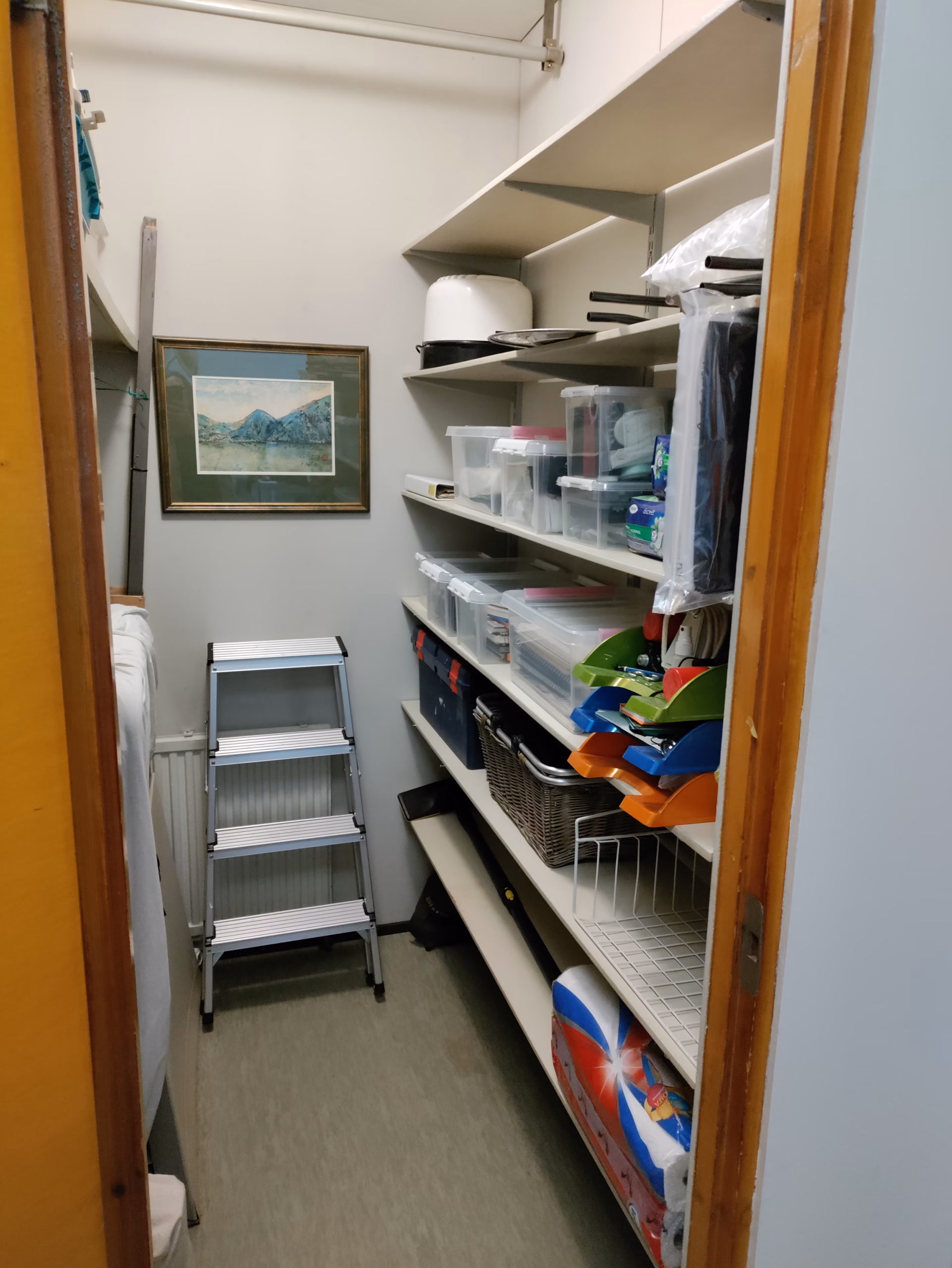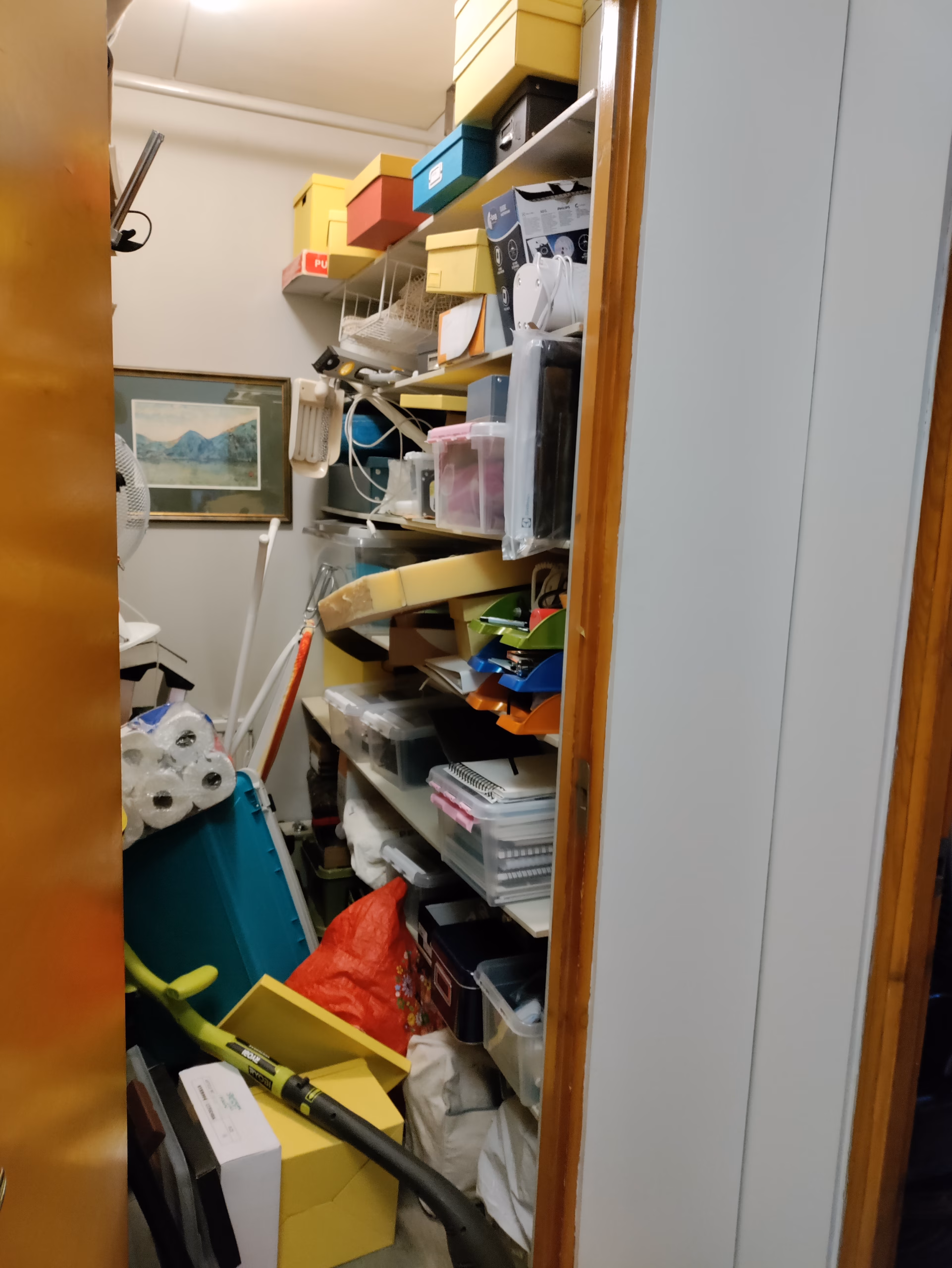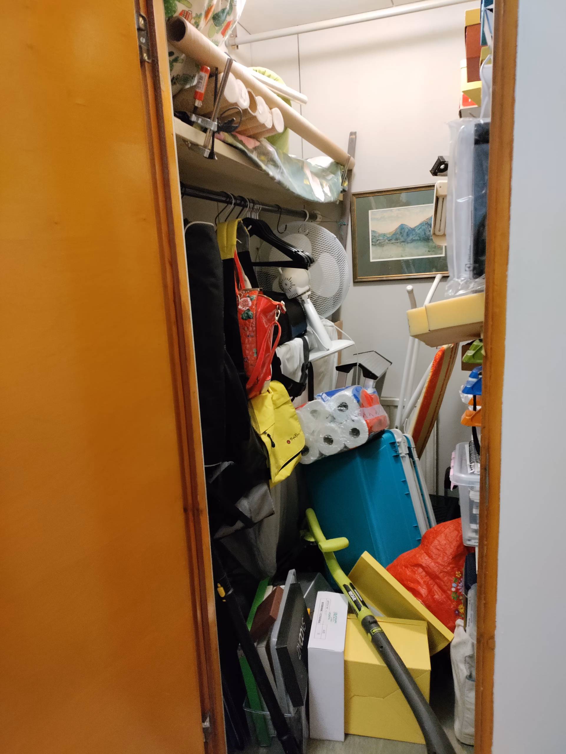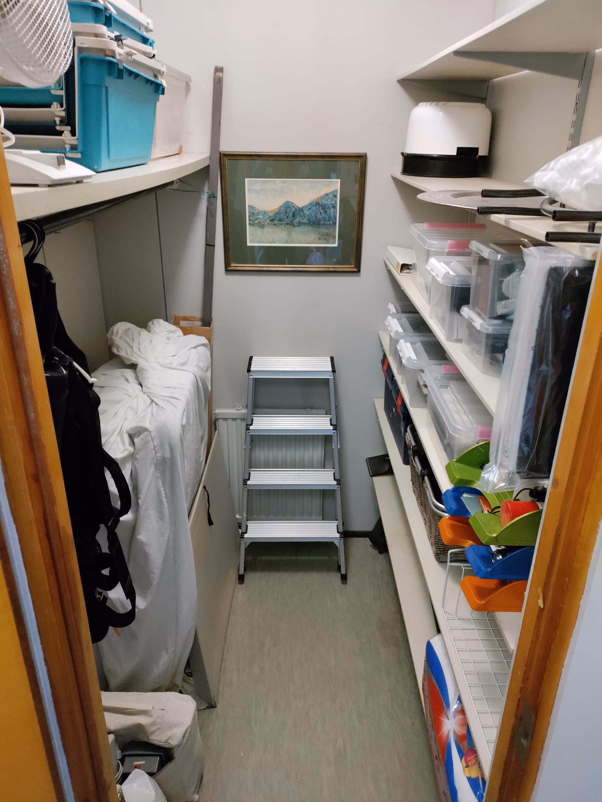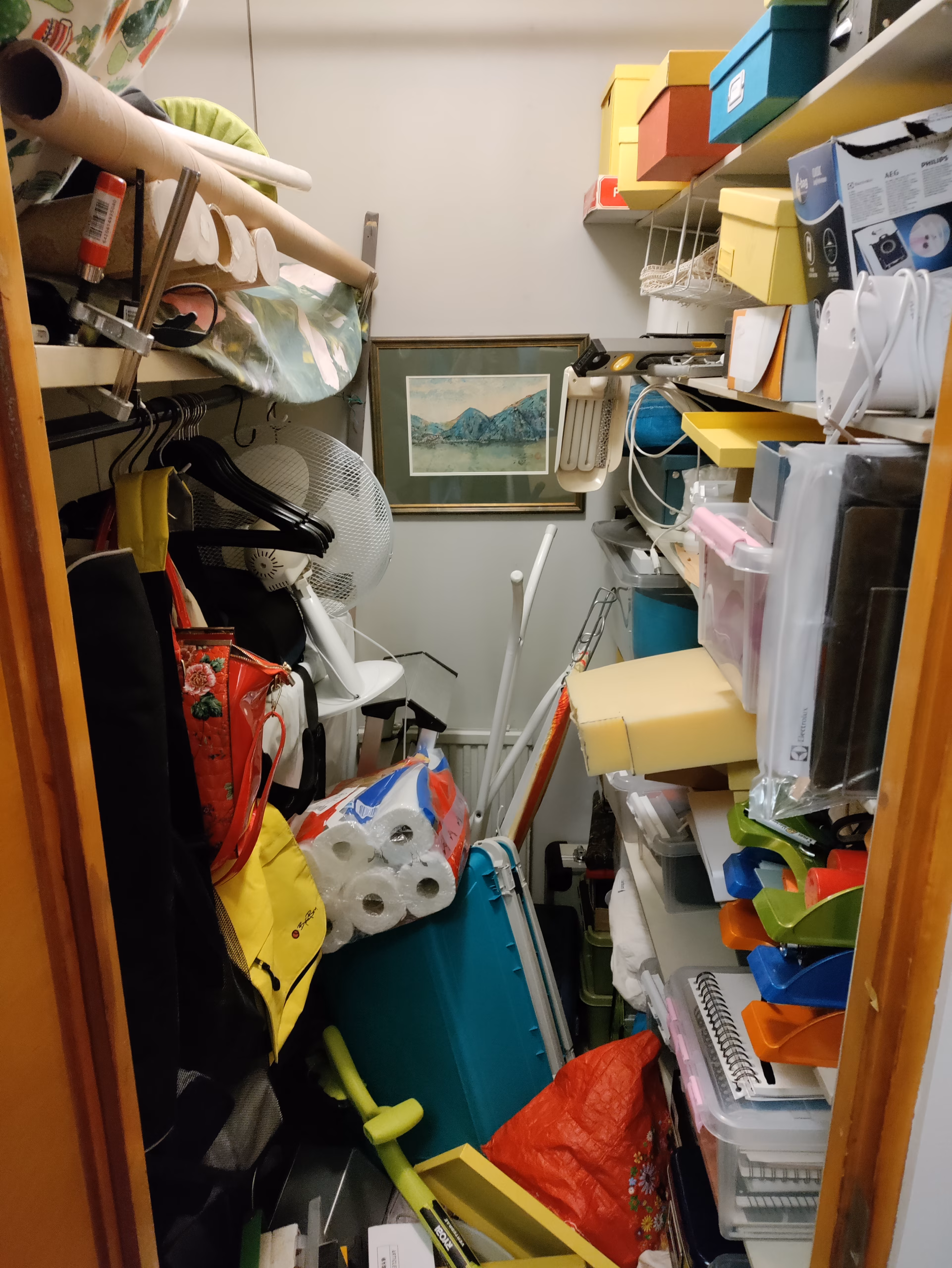 Perheelle tarpeellinen ei-käytössä-olevien vaatteiden varastotila oli tukkeutunut. Tilaan ei päässyt edes sisään ja urakan suuruus sai lykkäämään aloittamista. Tsempin ja ideoiden myötä varasto järjestyi helposti käytettäväksi: nyt tilasta on helppoa hakea tarvitsemansa ja kaivattua tyhjääkin tilaa saatiin.
